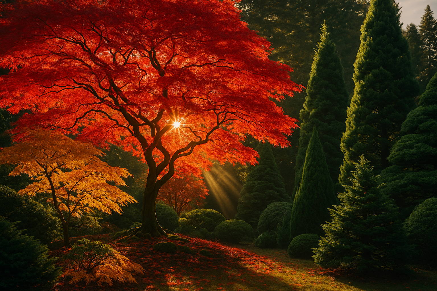 🌳 Anchors / Featured Elements: Luminous Maples • Rare Dwarf Conifers • Central Focal Specimen